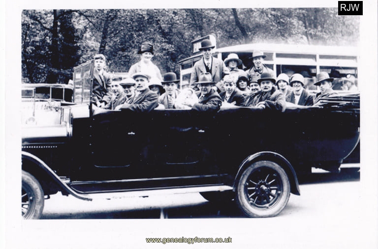 "My Great Uncle Dennis Young in the Fedora at the back and Great Aunt Nell sitting next to him on a trip from Bell End Rowley 1920's"