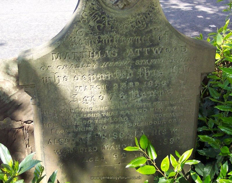 Matthias Attwood of Cradley Heath, Staffordshire, who departed this life March 23rd 1876 aged 76 years.