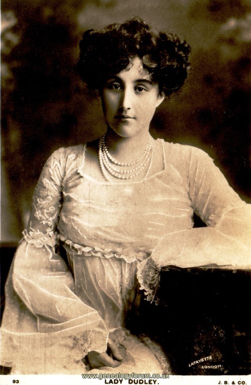 Lady Dudley, obviously part of a pair of postcards with her husband. Date? The postcard is definitely 1903 or after, I would guess Edwardian and pre-WWI.